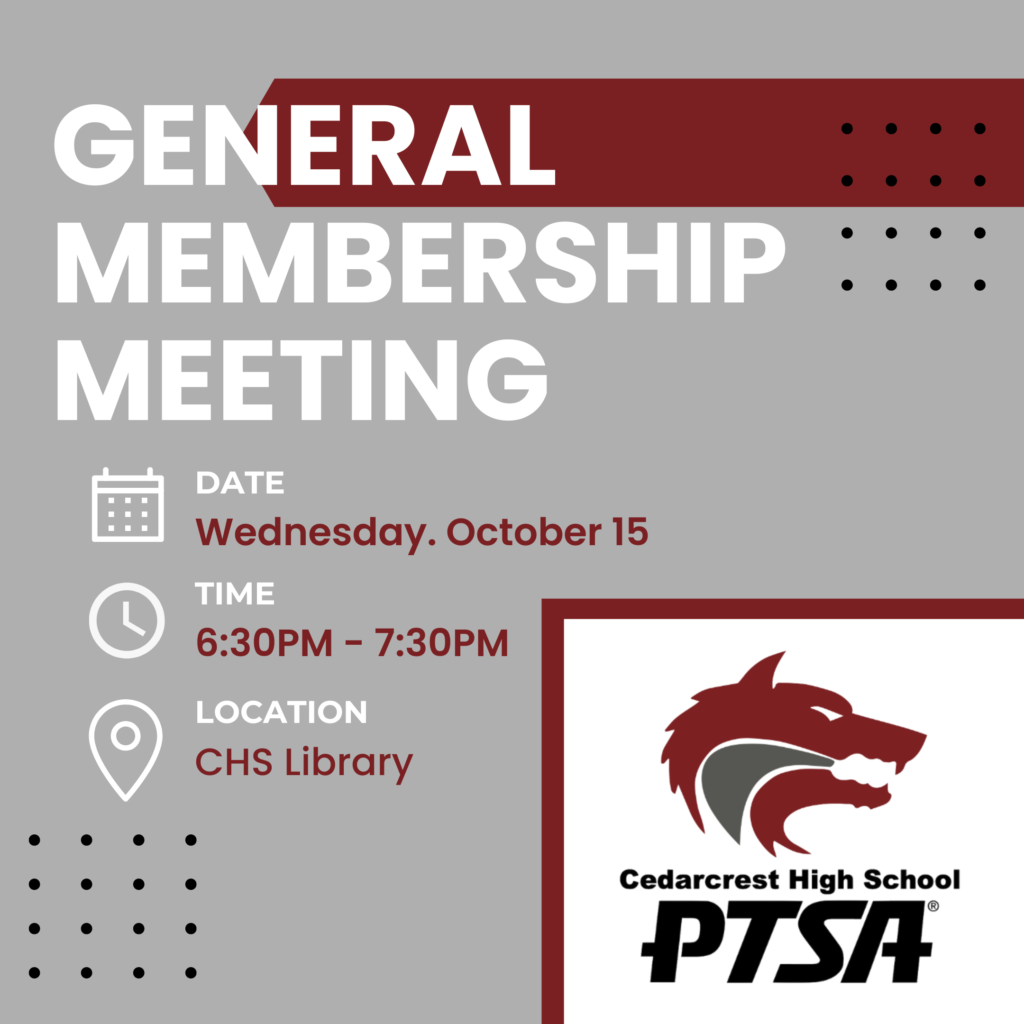 THIS WEDNESDAY - GENERAL MEMBERSHIP MEETING #1 Join us for our first General Membership PTSA meeting of the year THIS Wednesday, October 16th at 6:30pm, in the CHS Library. Principal Siemers will be joining us to give a school update and we will be taking care of beginning of the ...